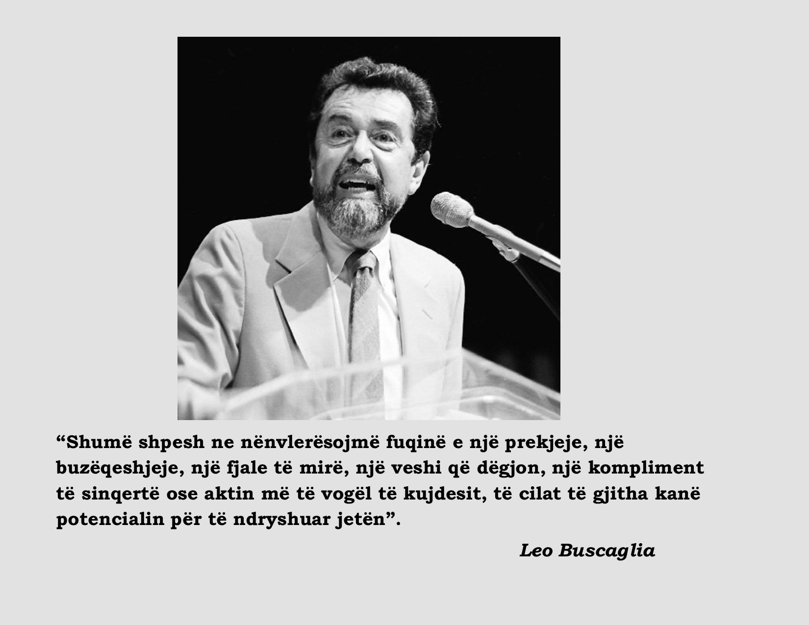 “Jeta është pasuria jonë më e madhe dhe dashuria pohimi i saj më i madh. Të jetosh duke dashuruar veten dhe të tjerët përfaqëson sfidën më të madhe, aventurën më ngazëlluese dhe krijuese të ekzistencës sonë”.