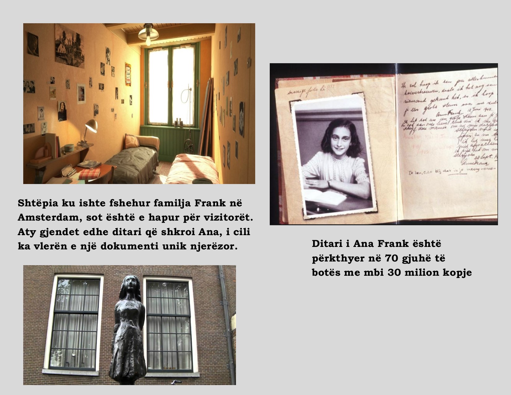Këto janë fjalët e fundit që Ana Frank shkroi në ditarin e saj, më 1 gusht 1944. Të gjithë personat që fshiheshin në godinë u zbuluan, u arrestuan dhe u dërguan në kampet e vdekjes. Ana vdiq në mars të vitit 1945. Babai i Anës, Oto Frank, i vetmi anëtar i familjes që i mbijetoi Holokaustit, vendosi ta botojë ditarin si një dëshmi se vajza e tij jetoi, dashuroi dhe shpresoi. Ana u shndërrua në zërin e gjashtë milionë hebrenjve, viktima të holokaustit.