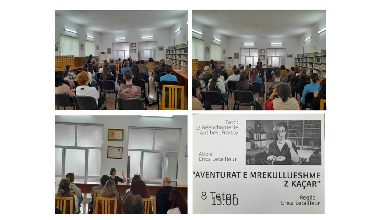 Festivali Ndërkombëtar Teatror i cili tashmë është kthyer në traditë në jetën kulturore të qytetit, erdhi në sallën e bibliotekës me një shfaqje interesante nga Teatri La Reenchanterie Antibes, Francë. Regjizorja dhe aktorja e talentuar Erica Letailleur solli në një monolog artistik pjesën me titull “Aventurat e mrekullueshme të Ajshe-s që nuk ekziston”. Në lojën e saj elegante, Erica, rrëfeu jetën e Aishes, që nga fëmijëria, edukimi, frikërat e saj, amësia, problematikat dhe komplekset e jetës së saj zhgënjyese në një botë që e detyron të heqë dorë nga ëndrrat e saj duke e bërë pjesë të padukshme të turmës. Rrëfimi i saj i drejtohet kujtdo, kurdo dhe kudo ku vajzat me ëndrra si Aishja bien pre e klisheve dhe e fatkeqësive, të cilat mbyten në ritmin e mosegzistencës së tyre dhe humbin ftohtësisht pas gjerbjes së një filxhani çaji në ballkonin e tyre i cili më shumë duket sikur i ndan sesa e bashkon me botën jashtë.
